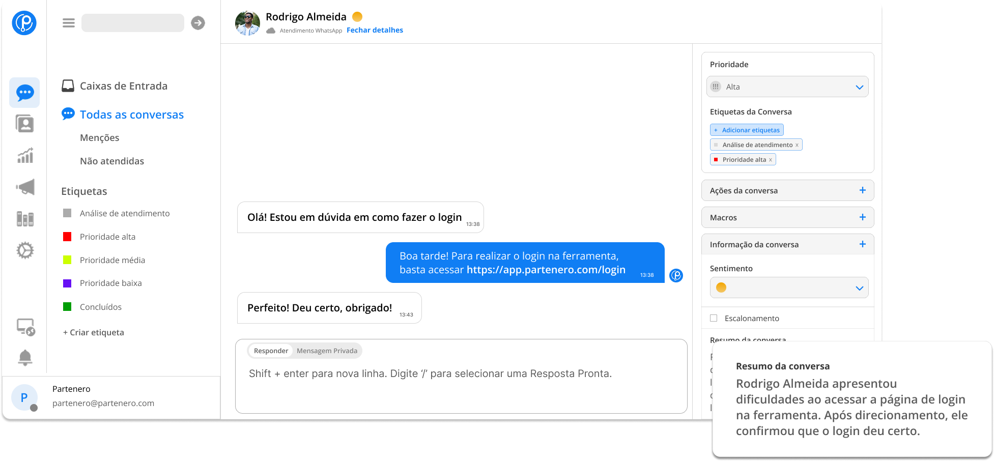 Aumente a produtividade da equipe de atendimento e a satisfação dos clientes com a ferramenta de Atendimento omnichannel da Partenero: WhatsApp, e-mail, chat, redes sociais, respostas prontas, IA para auxiliar respostas, indicadores de saúde e monitoramento da jornada do cliente.