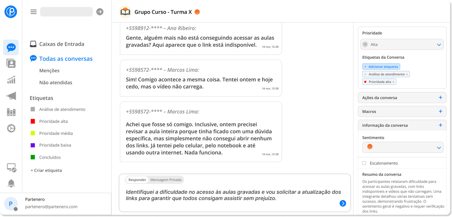 Analise as trocas de mensagens individuais e de grupos de WhatsApp para melhor priorização e experiência dos clientes.