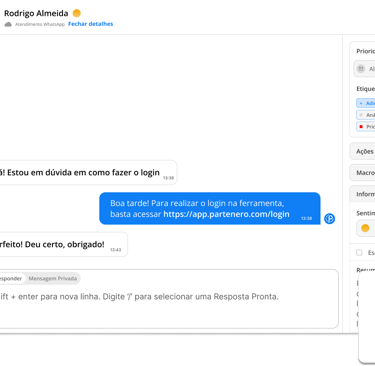 Responda perguntas dos seus clientes utilizando FAQ ou informações do Customer Data Plaform (CDP) da Partenero, tais como informações de cadastro, financeiras e produtos.