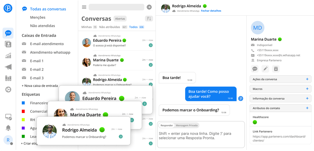 Faça o atendimento omnichannel dos clientes, incluindo contatos e grupos do WhatsApp. Tudo isso com informações precisas sobre a saúde e jornadas dos clientes em tempo real.