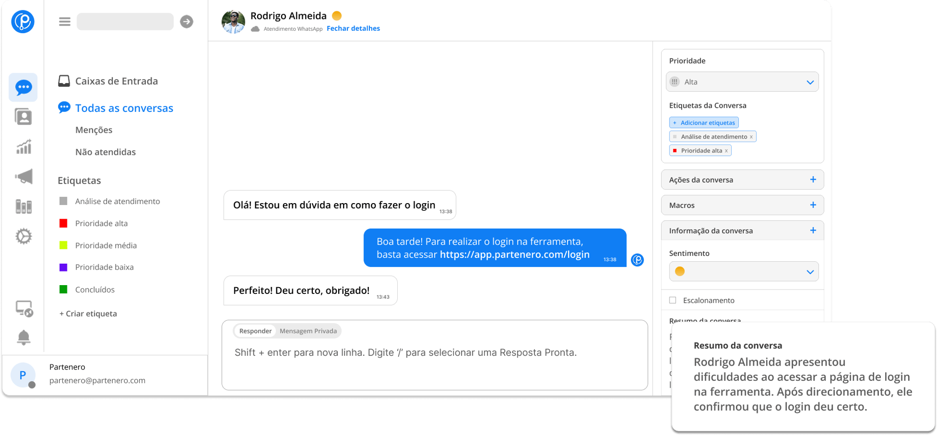 Resuma as conversas, gere planos de ação e automatize alertas para a equipe.