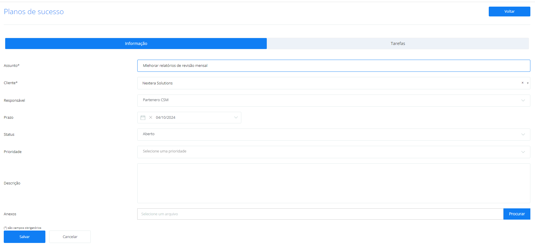 Com o Plano de Sucesso, você pode criar metas claras e específicas para cada cliente, alinhadas às suas necessidades e expectativas. Formalize objetivos de curto e longo prazo, personalizando o plano conforme a parceria evolui e surgem novas oportunidades.