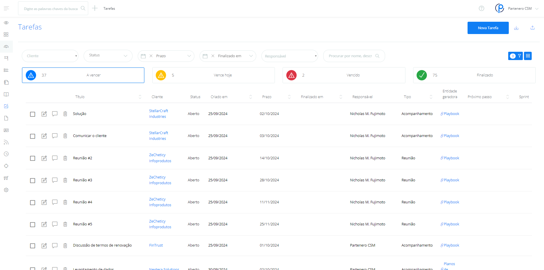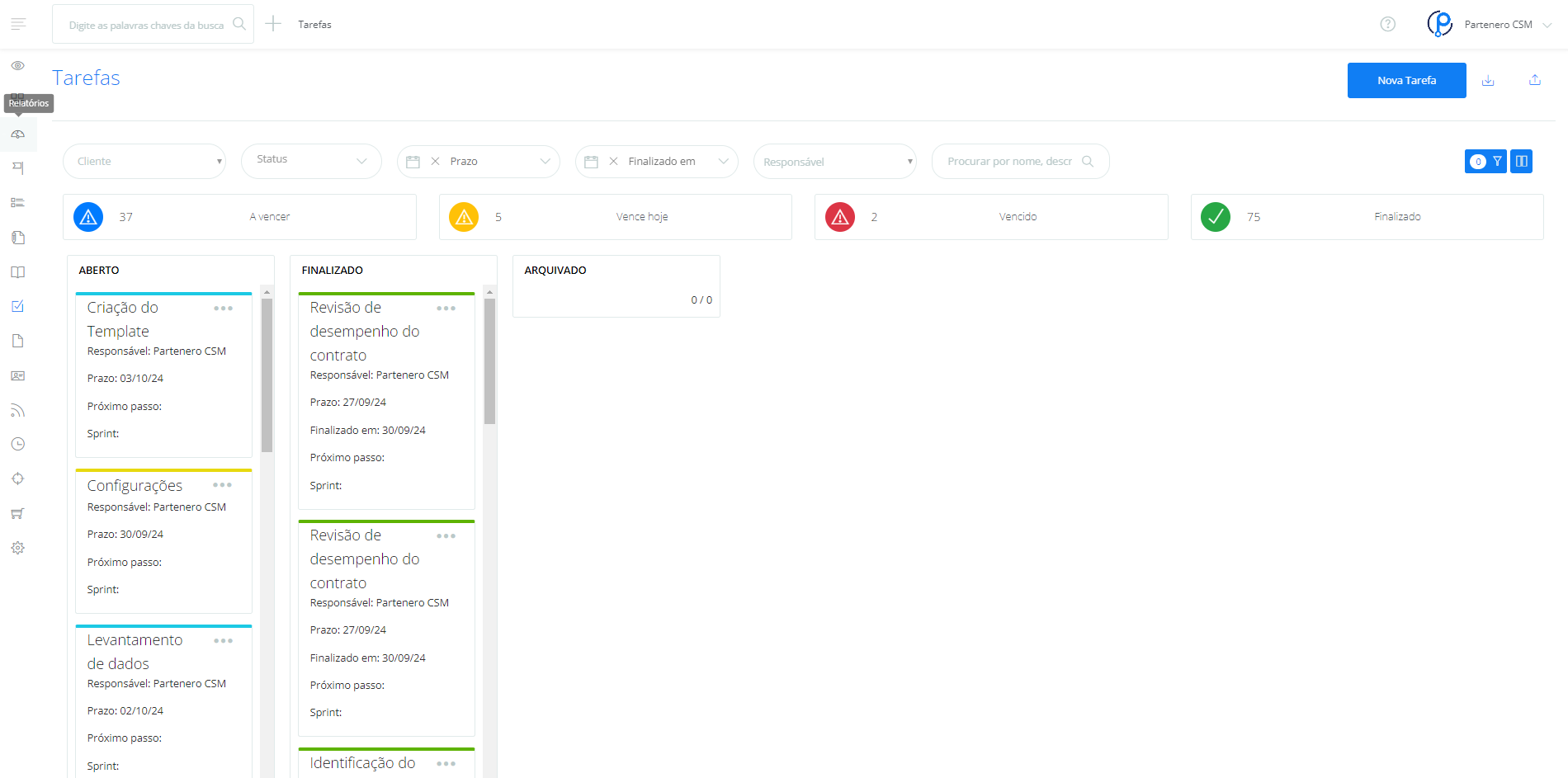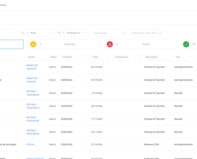 Com o Gestor de Tarefas da Partenero, sua equipe pode criar, delegar e monitorar todas as atividades relacionadas ao cliente em um só lugar. Defina prazos, receba notificações e garanta que nada fique pendente, aumentando a produtividade e o foco no que realmente importa.